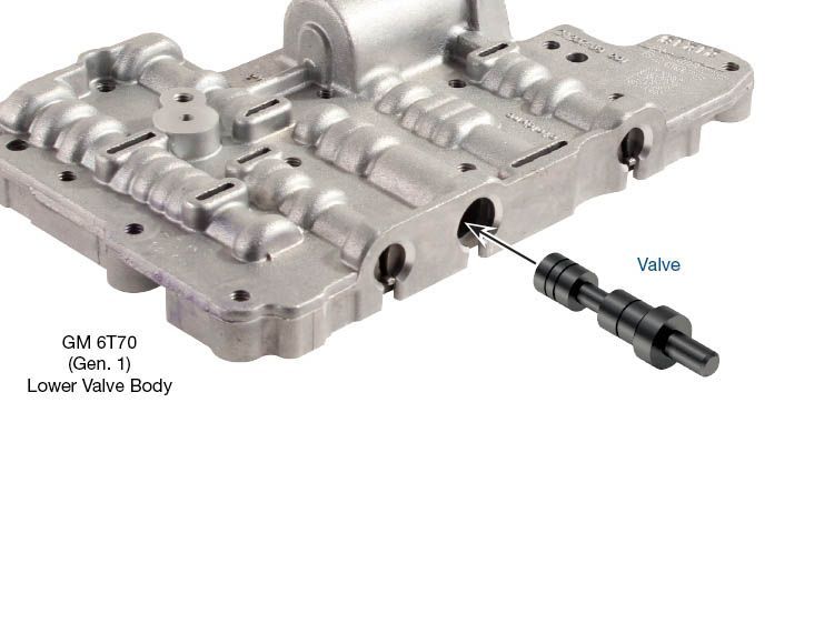 AFL valve 6T70, 6F50 In Ford 6F50/55 and first generation GM 6T70/75 units, AFL/solenoid pressure regulator bore wear results in low pressure at the shift and control solenoid valve assembly. The OE valve has a large reaction area and is highly affected by side loading, which wears the valve body bore. As the bore wear increases, oil pressure is reduced to the shift solenoids, which causes solenoid and ratio codes. This also results in lower line pressure. Sonnax oversized AFL/solenoid pressure regulator valve 124740-01 is a solenoid feed regulator valve that feeds the control solenoid valve assembly. The valve will restore hydraulic control to the shift solenoids. Valve is hardcoat anodized to reduce wear Symptoms: Clutch failure Solenoid codes Wrong gear starts Cause: Excess bore wear at AFL (actuator feed limit—GM) or solenoid pressure regulator (Ford) bore allows pressure loss that causes driveability concerns. Correction: Recover hydraulic control and renew shift operation by reconditioning the bore and installing Sonnax oversized AFL/solenoid pressure regulator valve. Required tool: F-104740-TL12