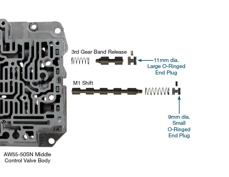 End plug kit AW55-50 • End Plugs, 9mm (4) • End Plug, 11mm • O-Rings, small (6) 2 Extra • O-Rings, Large (2) 1 Extra • No special tools required. • Prevents loss of critical pressure. • Sonnax kit services 5 different bores. Can be used in other bore locations as applicable. Symptoms: • 2-3 Flare • 3-2 Neutral • Delayed Forward • Low SLT pressure • Overheated fluid • Poor shift quality • TCC slip Cause: Valves and springs push on the end plugs, eventually causing distortion and excessive clearance between the plug and bore. Correction: Sonnax O-ringed end plugs restore correct circuit pressures.