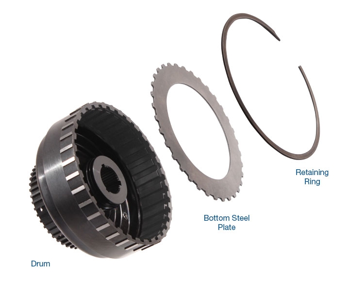 Smart-Tech® High Capacity Forward Clutch Drum KitPart No. 76655-01K Forward clutch durability is an issue in listed Ford performance applications. This problem often is addressed by eliminating the wave plate to fit more clutches, but plate removal creates harsh engagements and affects shift timing. Another common failure of stamped drums is cracking at the snap ring groove. The unique design of the Sonnax Smart-Tech high capacity forward clutch drum kit 76655-01K increases clutch capacity without abandoning the wave plate. The forged, one-piece drum prevents clutch drum breakage by eliminating weakness at critical stress points. Increase Clutch Capacity, No Modifications RequiredThe physically larger clutch pack area in the Sonnax drum kit increases capacity by 20% when using six OE-thickness frictions and steels. Using OE-thickness steels maximizes heat dissipation to prevent burnt clutches. Prevent Clutch Drum BreakageThe manufacturing process of the OE snap ring groove creates high-stress points around the circumference of the forward drum. The drum is active in 1st, 2nd and 3rd gear ranges and suffers the most abuse on a forced 4-3 kick down when it reapplies at higher pressure. The concurrent pressure from the forward clutch piston combined with the high stress at the snap ring groove causes the upper portion of the drum to split and separate at the groove. Depending on severity of the crack, this can result in no forward engagement or slipping in 1st, 2nd and 3rd gear. The one-piece, forged Sonnax drum kit is more durable than stamped drums and features increased groove depth for additional ring support. These are the same features found in the Smart-Tech standard capacity drum 76654-01K - watch this video for details. Increase clutch capacity by 20% without removing the wave plate One-piece, forged drum design prevents cracking Note: To replace an AOD cast forward drum requires updating related components with AODE versions. U