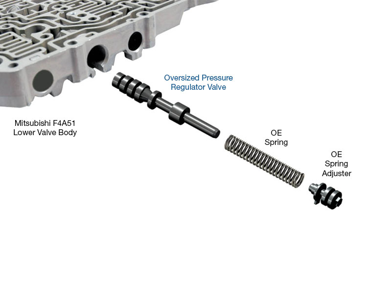 Press.reg.v. F4A41, F4A51 (OS) If wear in Mitsubishi F4A and F5A applications occurs at the balance/inboard end, the valve will not stroke to reduce line pressure and reduces feed to the converter/lube circuits. This can result in high line pressure, harsh shifts, reduced converter pressure and loss of lube. Severe wear at the other pressure regulator valve circuits can allow line pressure to exhaust, resulting in low line pressure, soft shifts and burnt clutches and bands. Sonnax oversized pressure regulator valve kit 41954-01K restores the valve body to normal operating condition. Valve is hardcoat anodized to reduce wear NOTE: May be used in Mitsubishi front wheel drive, 96-later valve bodies including F4A41/42/51, F5A51 and Hyundai/Kia A5HF1 and A5GF1. However, OE valve spool diameters MUST be measured to verify application. This kit CANNOT be used in rear wheel or all wheel drive units. Required tool: F-41954-TL