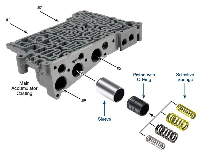 Accumulator Piston Kit Partnr. 39741-42K Worn-out accumulator piston bores in listed Aisin AW 6-speed units allow pressurized transmission fluid to leak past the accumulator piston to the sump. These leaks can result in a flare at upshift, delayed engagement, poor line rise or clutch failure. The Sonnax accumulator piston kit 39741-42K will restore a worn accumulator bore and correct leakage problems. • Salvages valve bodies with severe accumulator bore wear • O-Ring seal improves piston response Symptoms: • Severe wear at accumulator bores • Low clutch oil pressure • Low TCC pressure • Low EPC pressure Cause: Since the length of the OE accumulator piston is short relative to its diameter, the effect of incidental side loading forces is increased. This characteristic, combined with relatively strong nested springs and the soft material of the valve body, results in severe wear. This extreme wear is noticeable in many low mileage units. Correction: Installing the Sonnax sleeve creates a new accumulator bore surface in severely worn valve bodies. Our improved sleeve design provides increased wear resistance and sealing. The kit comes with an assortment of custom-designed springs which allow you to duplicate and restore OE accumulator calibration and response.