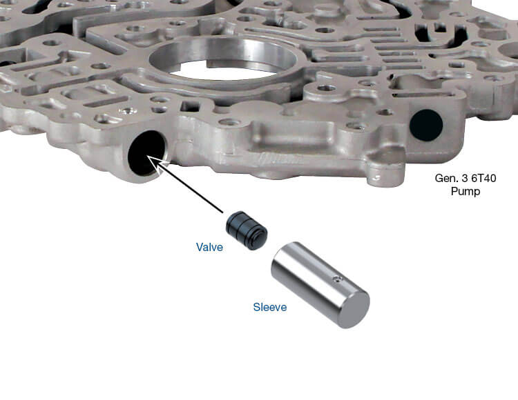 Pressure Regulator Isolator Valve KitPart No. 144510-15K Vehicles with listed GM Gen. 3 6T40 transmissions may exhibit no line rise or low line pressure due to excess wear in the pressure regulator isolator valve assembly. The pressure regulator isolator valve reacts against the pressure regulator valve, controls balance pressure, and dampens and smooths pressure pulses from the pressure control solenoid. Excess wear can lead to undesirable shift operation and burned clutches. Installing Sonnax pressure regulator isolator valve kit 144510-15K restores proper line pressure control for renewed shift feel and performance. Sleeve manufactured from highly wear-resistant aluminum Hardcoat anodized aluminum valves combat premature wear Annular grooves help center valve in sleeve to reduce future side-load wear Drop-in Zip Valve™ parts install quickly and easily Contents Valve Sleeve Symptoms: Low line pressure Line pressure instability Shift concerns Burnt clutches Cause: Pressure regulator isolator sleeve and valve wear results in poor line pressure regulation. Correction: Recover hydraulic control and renew line pressure performance by installing Sonnax drop-in pressure regulator isolator valve kit.