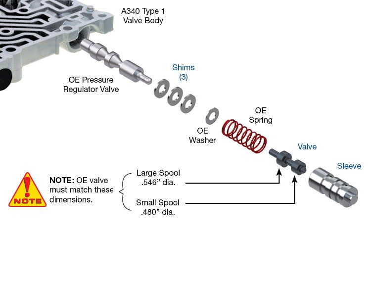Boostvalve A340 complete Sleeve Valve Shims (3) The steel OE valve in Toyota/Lexus A340, A340E/F/H type 1 transmissions moves within the cast aluminum sleeve, wearing the sleeve. After this wear becomes severe, the valve no longer operates properly, causing soft upshifts and delayed engagement. Sonnax boost valve kit 97855-30K will restore proper operation. Sleeve is made from high-quality aluminum for better wear resistance Hardcoat anodized aluminum valve combats premature wear