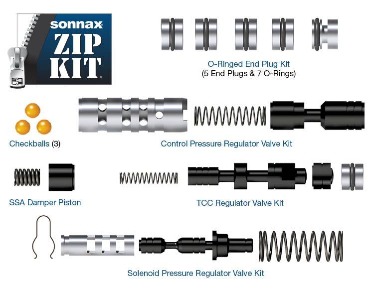 Zip kit 6F35 O-Ringed End Plug Kit Control Pressure Regulator Valve Kit TCC Regulator Valve Kit, Spring, Shuttle Valve, End Plug & O-Rings 2 O-rings, 1 extra AFL Balance Plugs (2) Not Shown Solenoid Pressure Regulator Valve, Sleeve, Spring & Retainer Clip SSA Damper Piston & Spring Checkballs (3) .250" dia. Drill Bit Not Shown Symptoms: Burnt brake clutches Burnt clutches Delayed engagement Inadequate lubrication Low pressure Slips & flares Soft shifts TCC apply & release concerns TCC codes Cause: Loss of oil pressure due to worn components in critical oil circuits. Correction: Recover hydraulic control and restore normal shift operation by installing Sonnax Zip Kit.