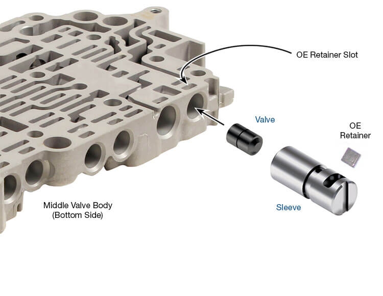 Vehicles with Toyota/Lexus U660E and U660F transmissions may exhibit 2nd and 6th Gear shift complaints and a burned B1 brake. These problems may be caused by continuous oscillation of the steel B1 apply boost valve within the cast aluminum boost sleeve, creating excessive wear and a path for line pressure to exhaust and the B1 apply control valve to stroke prematurely. Sonnax B1 apply boost valve kit 47740-19K has upgraded materials and minimal clearances to prevent wear and restore proper hydraulic control. • Boost sleeve is manufactured from highly wear-resistant billet aluminum to prevent excessive wear • Restores proper line rise • Drop-in Zip Valve™ parts install quickly and easily Symptoms: • 2nd & 6th Gear shift concerns • B1 Clutches burned Cause: Wear at the B1 apply boost valve and sleeve can allow the B1 apply control valve to stroke prematurely, resulting in 2nd and 6th Gear shift complaints and a burned B1 brake. Correction: This Sonnax drop-in B1 apply boost valve kit features upgraded materials and tighter clearances to prevent wear and restore proper hydraulic control. Contents: • Valve • Sleeve