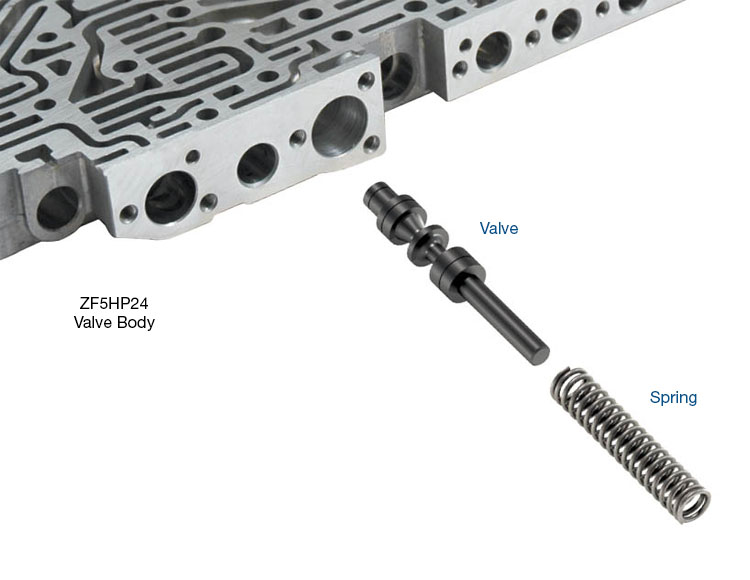 Pressure regulator valve ZF5HP24 Oversize • Valve • Spring Wear is commonly found at different areas in the ZF5HP24 pressure regulator valve bore. Wear at the inner portion of the bore causes high pressure spikes leading to broken drums, pistons or other parts, as well as restricting converter/lubrication flow. Wear at the spring end of the bore allows line pressure to exhaust resulting in low line pressure, soft shifts and burnt clutches. The Sonnax oversized pressure regulator valve kit 139740-01K restores valve-to-bore clearances so the pressure regulator valve can maintain correct pressures. • Annular oil grooves support the valve and reduce wear rate. • Restores valve-to-bore clearances maintaining correct pressures. Required tool: F-139740-TL