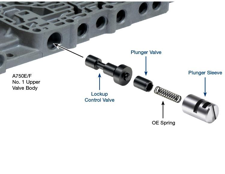 L/U ctrl plunger OS A750 / A760E / A761 Lockup Control Valve Plunger Valve Plunger Sleeve Symptoms: Harsh downshifts Overheated fluid RPM surge on coast TCC apply & release concerns TCC codes Cause: Wear at the lockup control valve results in the converter remaining applied and transferring shift shock. Loss of lube pressure and control timing also results in RPM fluctuation. Correction: The Sonnax oversized lockup control plunger valve and sleeve kit corrects lost lube pressure and control timing issues caused by a worn OE plunger valve and sleeve. Required tool: F-147741-TL16