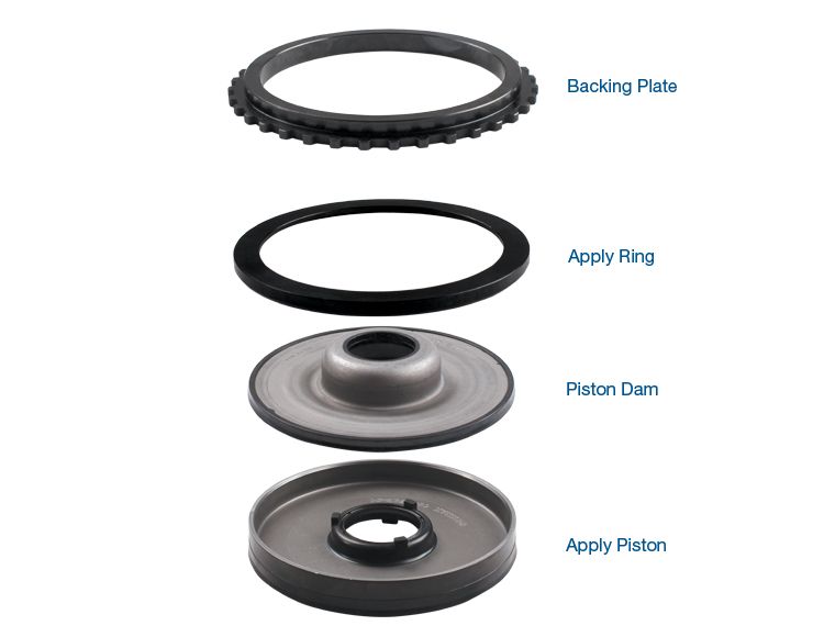 4-5-6 Clutch Apply Piston Kit Part No. 104960-01K GM 6L80 and 6L90 transmissions often suffer failure of the 4-5-6 clutch assembly due to OE design shortcomings. Insufficient clutch piston-to-plate apply surface area causes clutch plate failure, especially when apply pressures exceed OE specifications. The other problem is flexing and bowing of the backing plate (coning), which is a primary source of clutch failure. The heavy-duty Sonnax 4-5-6 clutch apply piston kit 104960-01K addresses these weak areas in two ways: A modified OE clutch apply piston and piston dam are used in conjunction with a specially-designed Sonnax piston apply ring. A more rigid backing plate. The Sonnax apply ring increases surface area between the apply piston and OE waved clutch plate, resulting in more even distribution of apply force to clutch plates. The Sonnax backing plate minimizes flexing/bowing when clutch is applied, drastically reducing the likelihood of clutch plate distortion. Solid backing plate design outperforms OE and aftermarket plates Increased apply ring surface area strengthens and reinforces assembly Contents Apply Piston Apply Ring Piston Dam Backing Plate Piston 4-5-6 Clutch apply kit 6L80E was added to your shopping cart. Shopping Cart » 104960-01K 45464 Piston 4-5