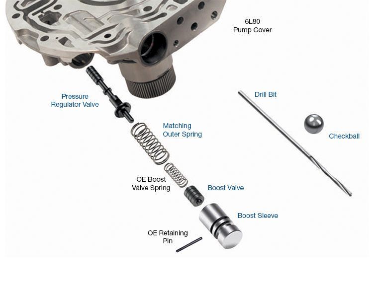 Press.reg. valve 6L45, 6L80, 6L90 OS Pressure Regulator Valve Matching Outer Spring Boost Valve Boost Sleeve Drill Bit Checkballs (2) 1 Extra Oversized pressure regulator valve and matched spring restore OE function Annular grooves help center valves in bore to reduce future side-load wear Hardcoat anodized aluminum valves combat premature wear. Symptoms: Burnt clutches Clutch slippage Converter concerns Harsh shifts High line pressure Low cooler flow Low line pressure Low line rise in Reverse No cooler flow Overheated transmission Cause: Continuous oscillation of pressure regulator valve results in excess bore wear, causing erratic line pressure and/or restricting cooler/lube flow. Wear at the boost sleeve induces Reverse issues. Correction: Recover hydraulic control and renew line pressure performance by reconditioning the bore and installing Sonnax oversized pressure regulator and boost valve kit. Required tool: F-104520-TL7C NOTE: Pump must be removed to install this kit. Use of the VB-06 is required with the VB-FIX reaming fixture for this installation unless the stator support shaft is removed from the pump body. Needs tool F-104520-TL7C