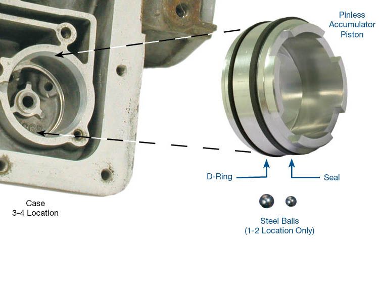 Accumulator 4L60E 'pinless' Pinless Accumulator Piston Aluminum D-Ring Viton® Seal PTFE Balls (2) Steel In 200-4R applications, this kit can only be used in the 3-4 accumulator location. In GM 200-4R, 4L60 and 4L60-series units it is common to have poor shift quality, burnt bands or clutches due to accumulator piston wear. Repeated reciprocation of the accumulator piston causes wear at the piston pin bore interface. After this wear reaches a critical point, fluid loss through the piston pin bore cannot be compensated due to lack of pump volume. In addition, the piston can get cocked and gall the accumulator bore due to the pin bore wear or the spring bottoming out. To prevent these conditions in the 1-2 or 3-4 accumulator bores, Sonnax offers pinless accumulator piston kit 77998-03K. Symptoms: Burnt clutches & bands Poor shift quality Cause: Wear at the piston pin bore due to repeated reciprocation. Correction: The Sonnax patented pinless design with dual seals stabilizes the piston in the bore and provides improved sealing characteristics. Use of the Sonnax part eliminates the need for the pins.