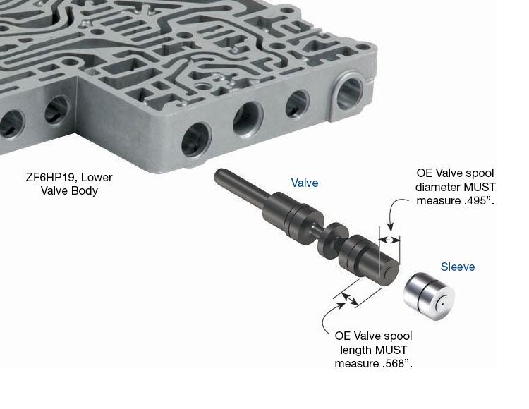 Press.reg.v. OS ZF6HP26, ZF6HP19 • Valve • Sleeve Cannot be used in units that have a 053 separator plate. OE valve name: SYS.DR-V Wear is commonly found at different areas in ZF6HP19/26/32 (Gen. 1) and Ford 6R60/6R80 pressure regulator bores. Wear at the sleeve end causes high line pressure leading to broken drums, pistons or other parts, as well as restricted converter/lubrication flow. Wear at the spring end of the bore allows low line pressure and lube/TC fluid to exhaust leading to a burned converter clutch and premature bushing failure. The Sonnax oversized pressure regulator valve kit 95740-01K restores valve-to-bore or sleeve clearances so the pressure regulator valve can maintain correct pressures. • Hard-coat anodized aluminum valve resists wear • Alloy aluminum sleeve is significantly more wear-resistant than the OE sleeve • Salvages valve body castings NOTE: Kit is NOT compatible with ZF6HP19/26/32 (Gen.1) units with an 053 separator plate code or ZF6HP21/28/34 (Gen.2) units. To differentiate between Gen. 1 and Gen. 2 valve bodies, see ZF Identification Guide. Required tool: F-95740-TL