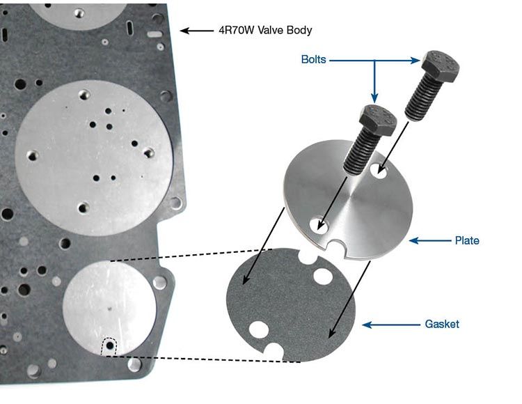 Spacerplate repair 4R70W 2001-up Plate Gasket Bolts (2) 2001 & later Symptoms: Cross leaks Forward & direct clutch fa…