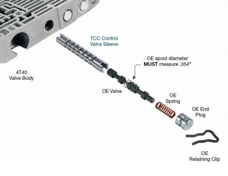 TCC Valve 4T40E Oversize Fits '03-earlier units with .354" dia. OE TCC control valve. Symptoms: Engine stall at idle …