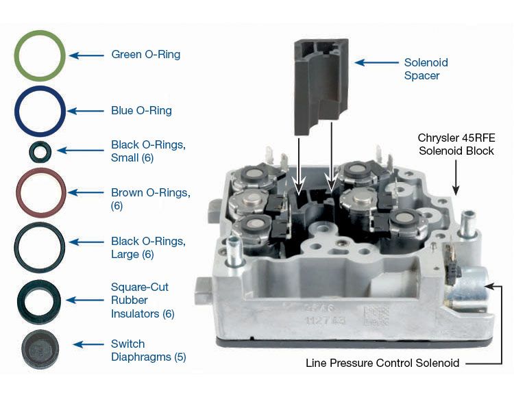 Solenloid repairkit 45RFE Solenoid Spacer Black O-Rings (6) Small Brown O-Rings (6) Black O-Rings (6) Large Square-Cu…